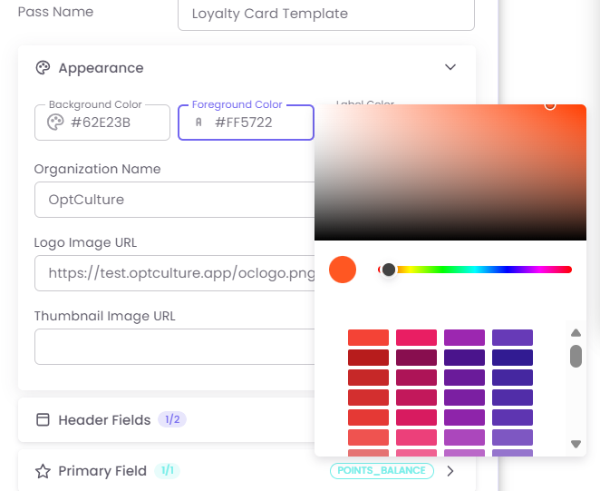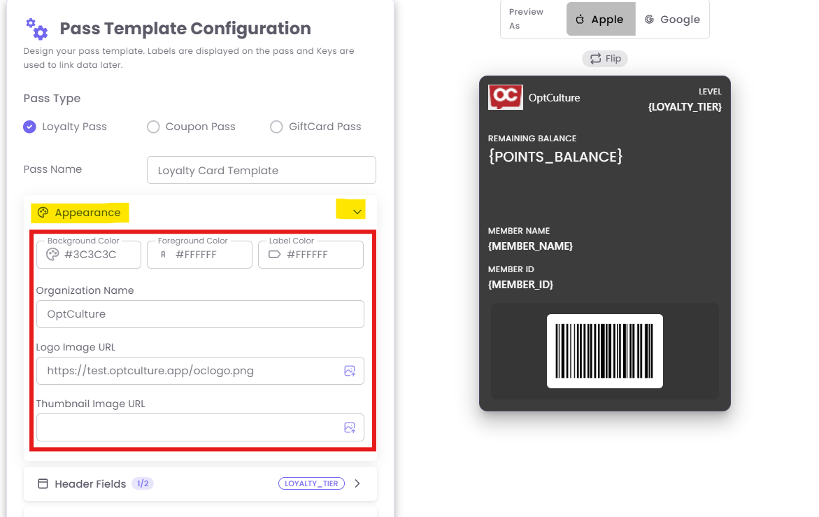The Pass Template Configuration page is where you map your brand's data to the visual layout of the card.