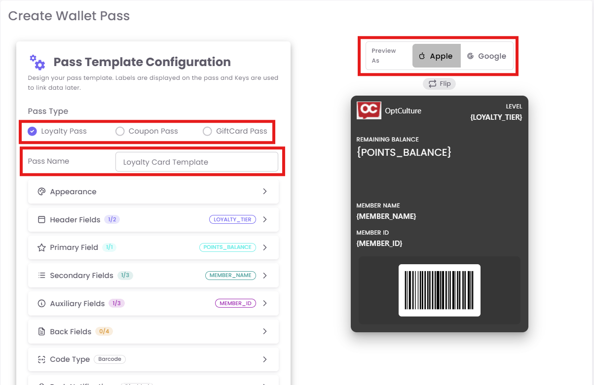 Pass Type: Choose from Loyalty, Coupon, or Gift Card.