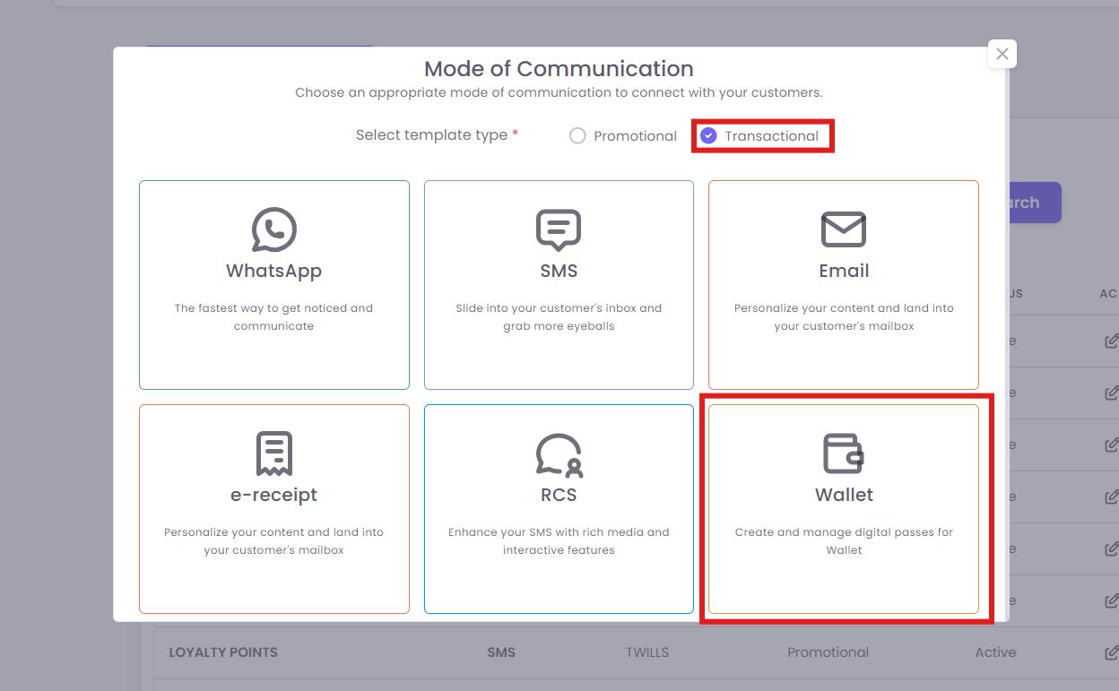 Step 2: Choose Transactional type and select the Wallet Card option (highlighted with a wallet icon).