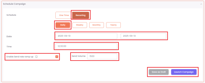 For example, to send a campaign to a segment of 10,000 contacts over 5 days, you can set a daily recurring schedule and enter a "Send Volume" of 2,000. The system will send the email to 2,000 unique contacts each day until all 10,000 have been reached. This strategy can help improve your sender reputation.