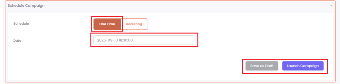 One-Time: This sends the campaign once at a specific date and time. This is ideal for time-sensitive offers or discounts that need to reach customers quickly.