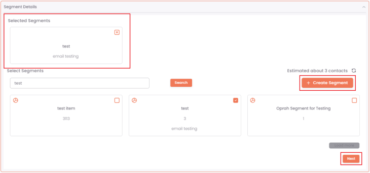 If you chose "Segment" as your contact source, you would have to select a pre-existing segment or create a new one using the + Create Segment button. Once selected, click Next.