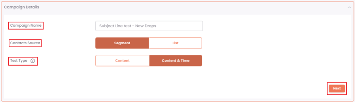 In the Campaign Name field, enter a clear and descriptive name that explains what you are testing (e.g., "Subject Line Test - New Collection" or "CTA Button Test - Summer Sale").