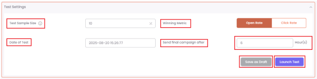 • Final Campaign Send Date: Specify how long the system should wait after the initial test to determine a winner (e.g., wait 4 hours). After this period, the winning variation will be automatically sent to the rest of your audience.