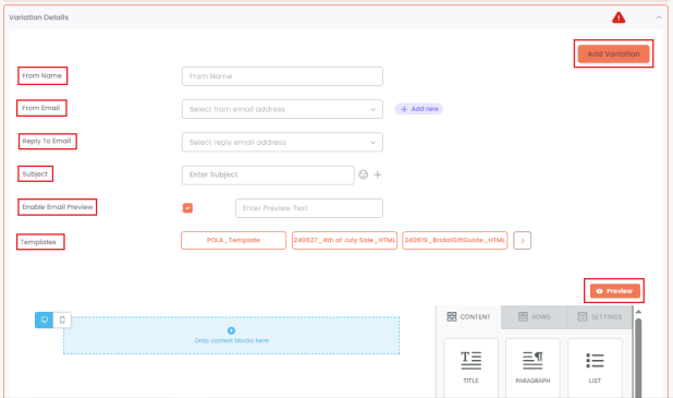 Click the Add Variation button to create another version of your email (Variation B, C, etc.). For each new variation, change the element you wish to test (e.g., write a different subject line for Variation B while keeping all other content the same).