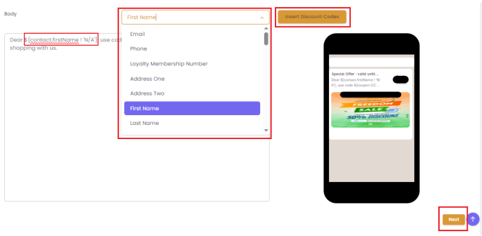 Add Personalization: To add merge tags (like a customer's name) or dynamic discount codes, click on the Add Merge Tags and Insert Discount Codes fields and select from the available options.