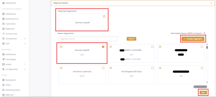 In the Segment Details section, choose who will receive your notification. You can select a pre-existing segment or click + Create Segment to build a new one. Click Next to proceed.