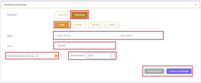 Ramp up: This advanced recurring feature helps you divide your segment into smaller batches ("Send Volume") and send the campaign to one batch at a time. For example, for a 10,000-contact segment, you could set a daily schedule with a "Send Volume" of 2,000 for 5 days. The system will send to 2,000 unique contacts each day until all 10,000 are covered.