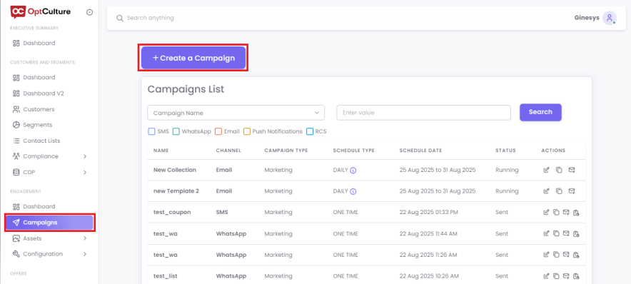 From the main dashboard, navigate to Campaigns on the left-hand menu. Click the + Create a Campaign button.