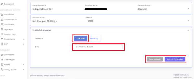 One-time: The campaign will be sent once as per the scheduled date and time.