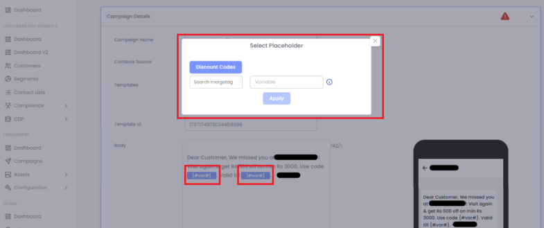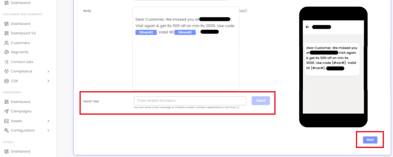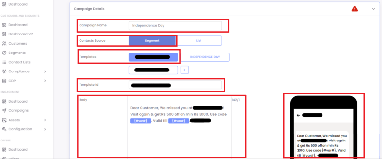 Message Template: Select a pre-approved message template or create a new template. (Note: DLT approval is mandatory in India).