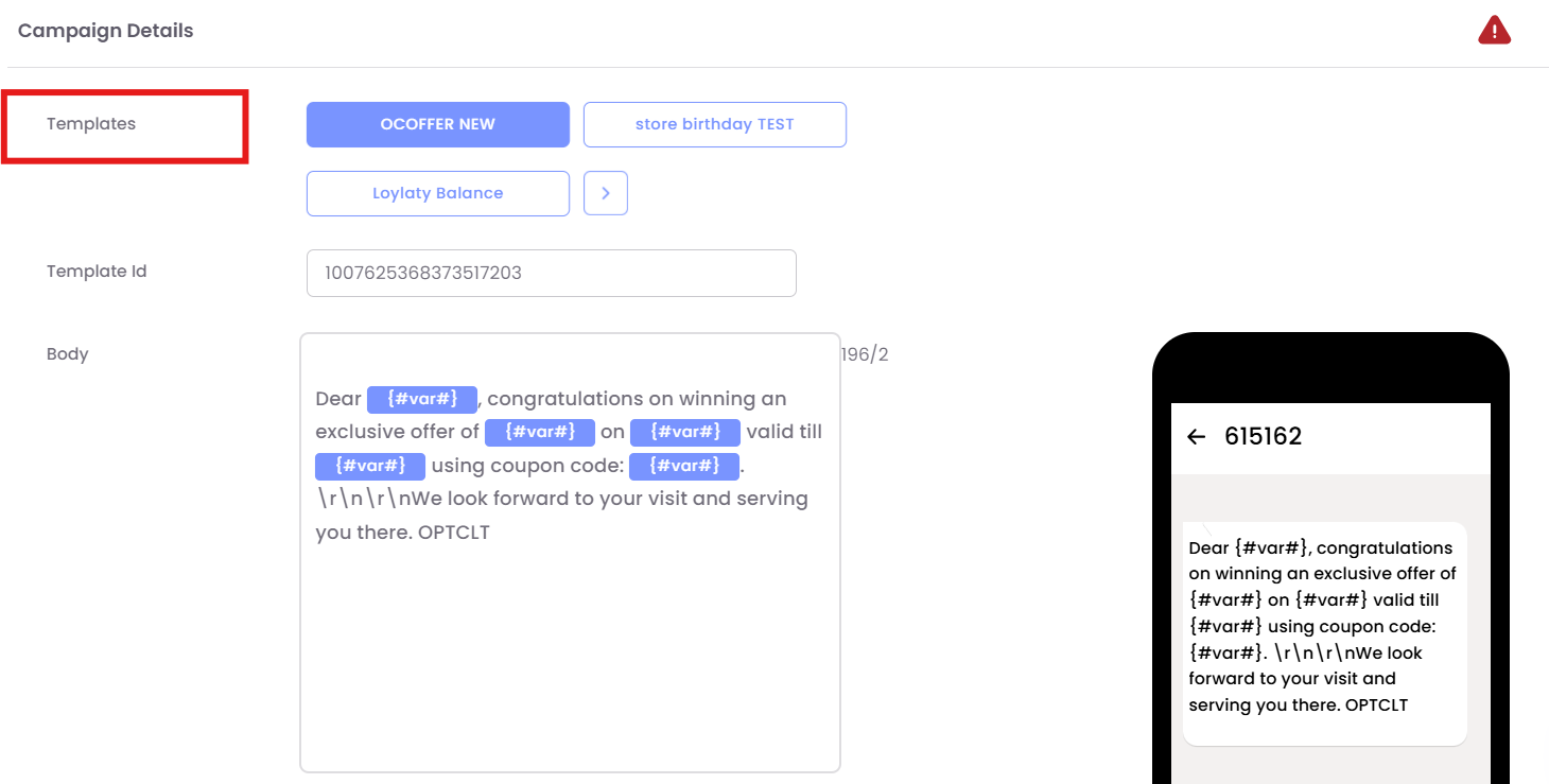 Select the pre-approved SMS template you wish to use (e.g., "OCOFFER NEW").
