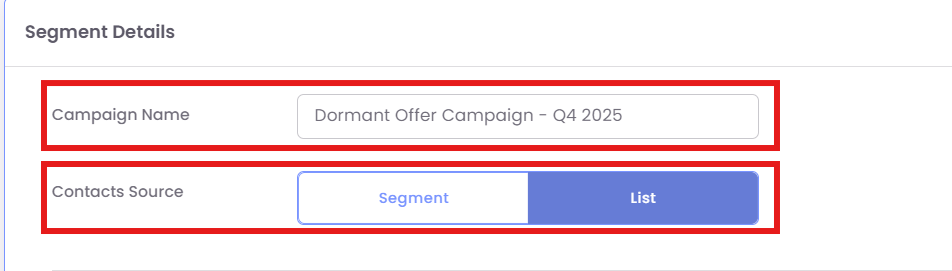 Campaign Name: Enter a clear, internal name for your campaign (e.g., "Dormant Offer Campaign - Q4 2025"). This is for your reference only.
