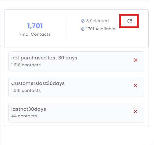 2. Click the Refresh icon (indicated by a circular arrow) next to the final contact count to ensure the most up-to-date count of contacts based on your selection.