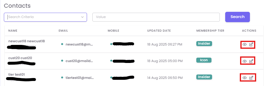From the list of contacts, locate the customer you wish to view. In the Actions column on the far right, click the View (eye) icon to open their detailed C360 profile.