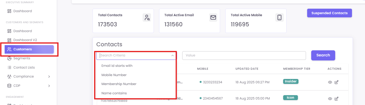 To begin, navigate to the Customers section from the main menu. On the Contacts page, you can use the Search Criteria dropdown to find a specific customer.