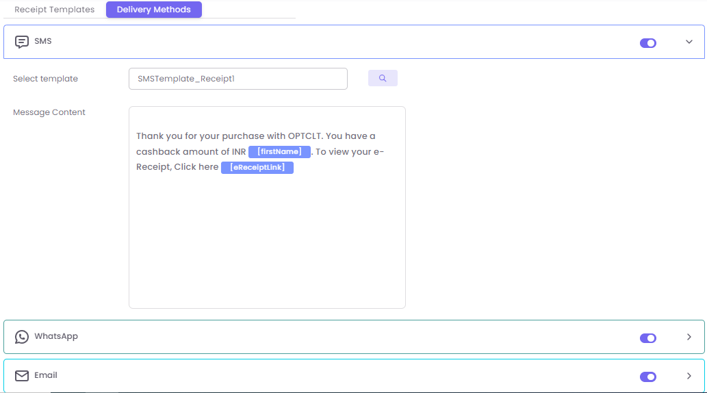 Message Content: Enter the text message the customer will receive. This message must contain the link for them to view their full receipt (e.g., "Thanks for shopping! View your e-receipt here: [link]").