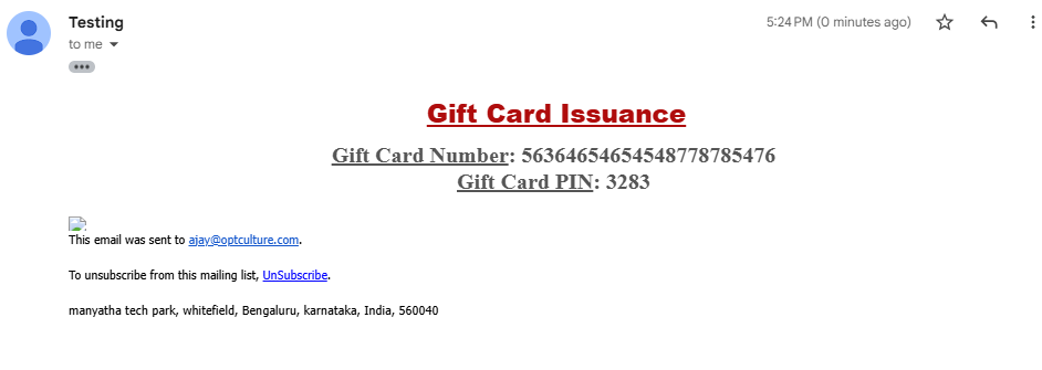 Once the transaction is complete, OptCulture automatically issues a virtual gift card to the customer via an automated communication (like WhatsApp or Email).