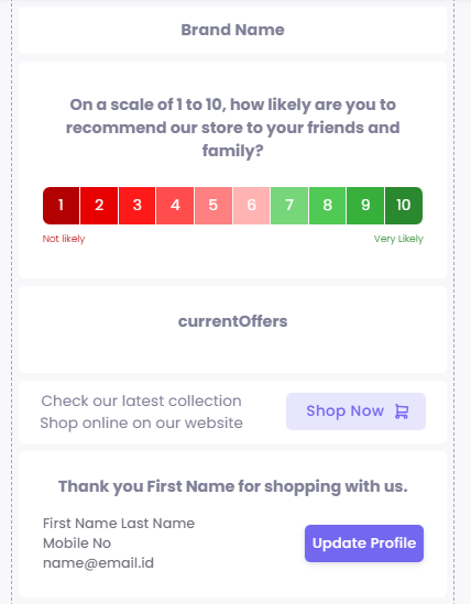 NPS Survey: A "On a scale of 1 to 10..." rating component to gather customer feedback.