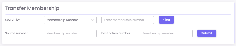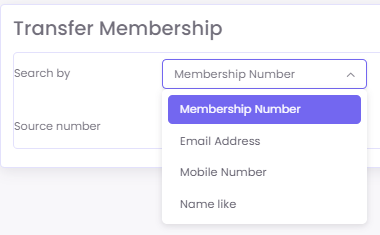 Use the Search by dropdown to select your search criteria. You can search by Membership Number, Email Address, Mobile Number, or Name like.