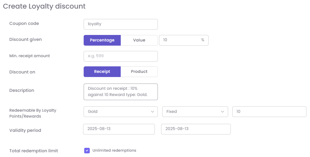 Coupon Code: A name for the discount (e.g., "10OFF-LOYALTY").