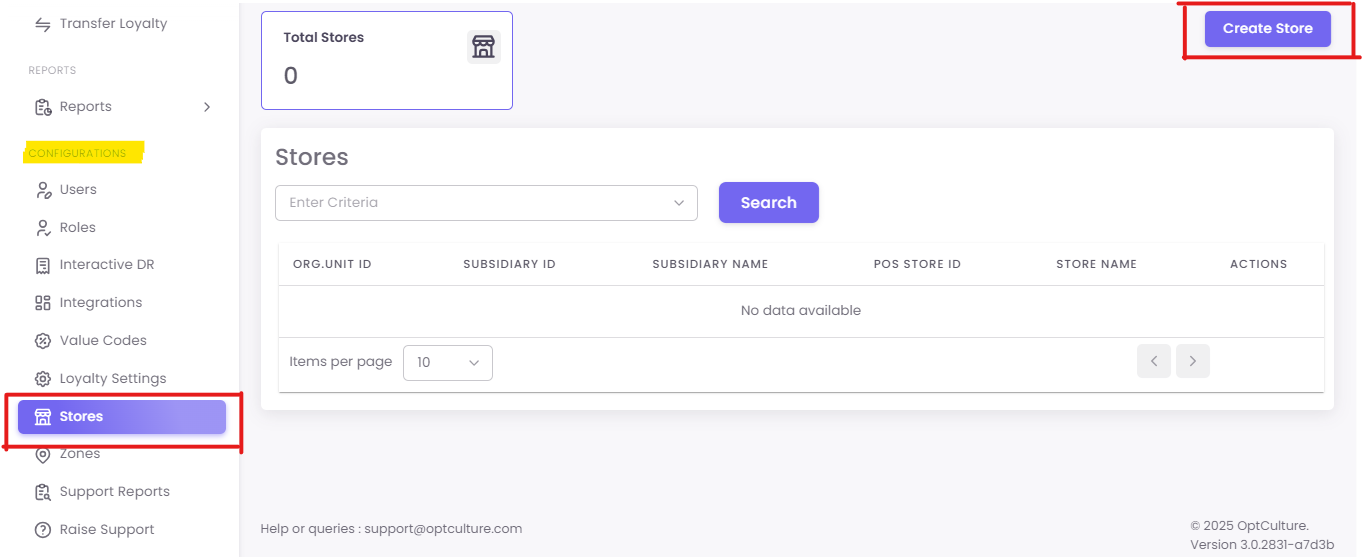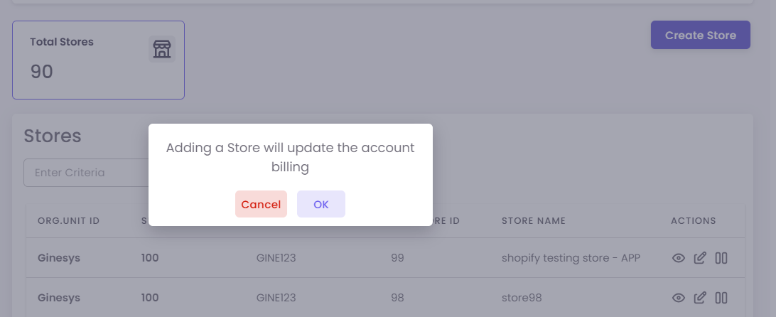On the Stores dashboard, click the Create Store button in the top right corner. A pop-up will appear with a warning that "Adding a Store will update the account billing." Click OK to proceed.