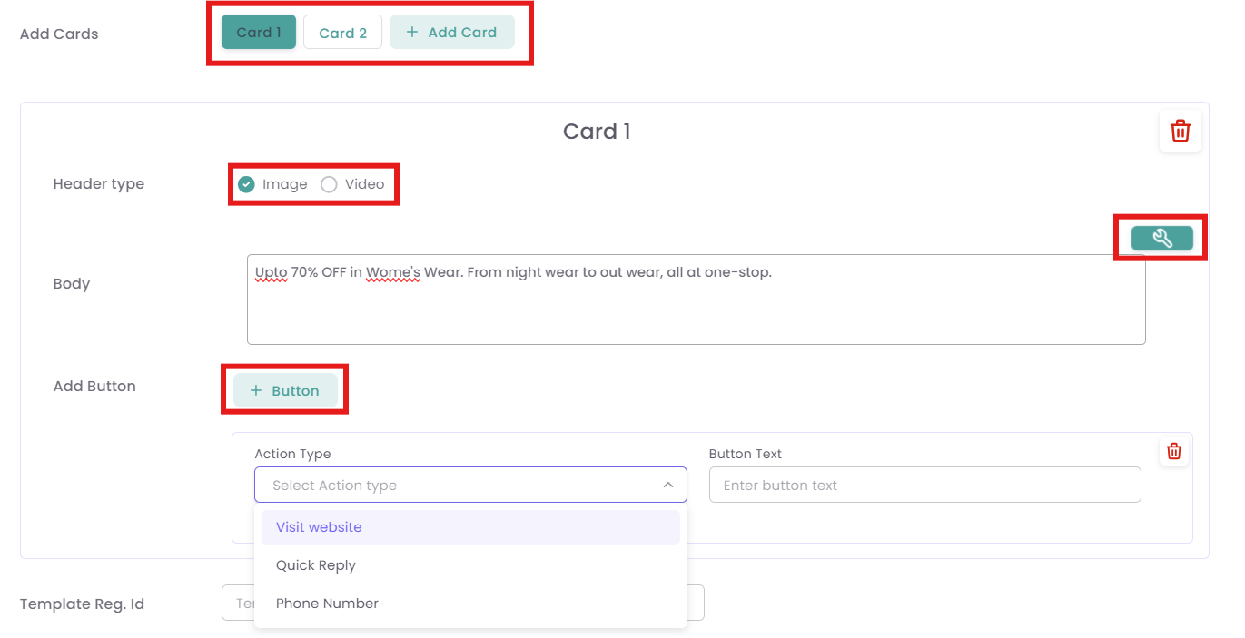Action Type: Select a button action, such as Visit website, Quick Reply, or Phone Number.