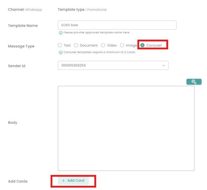 In the Add Template screen, under Message Type, select Carousel (highlighted).