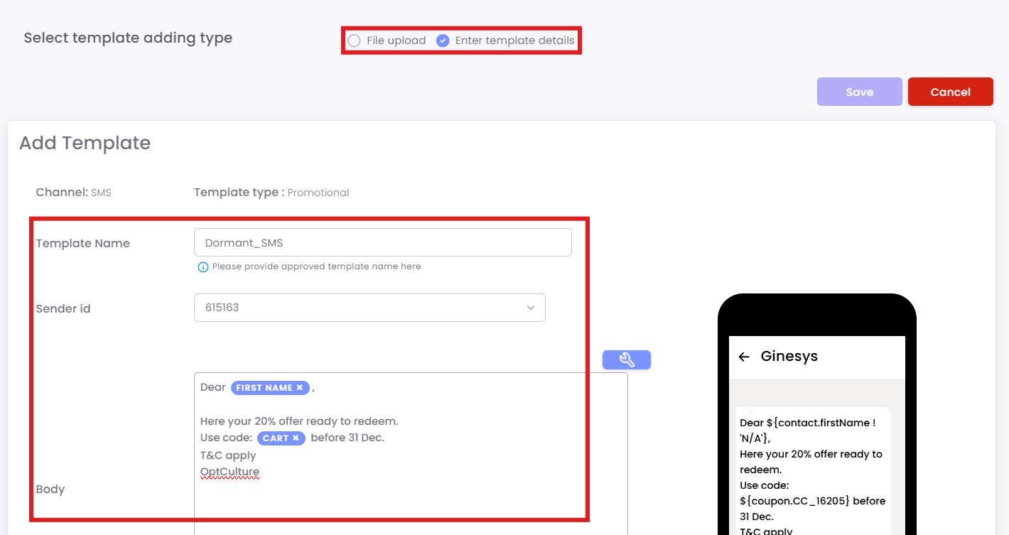 Choose file upload if DLT registered template or choose Enter template details to create template